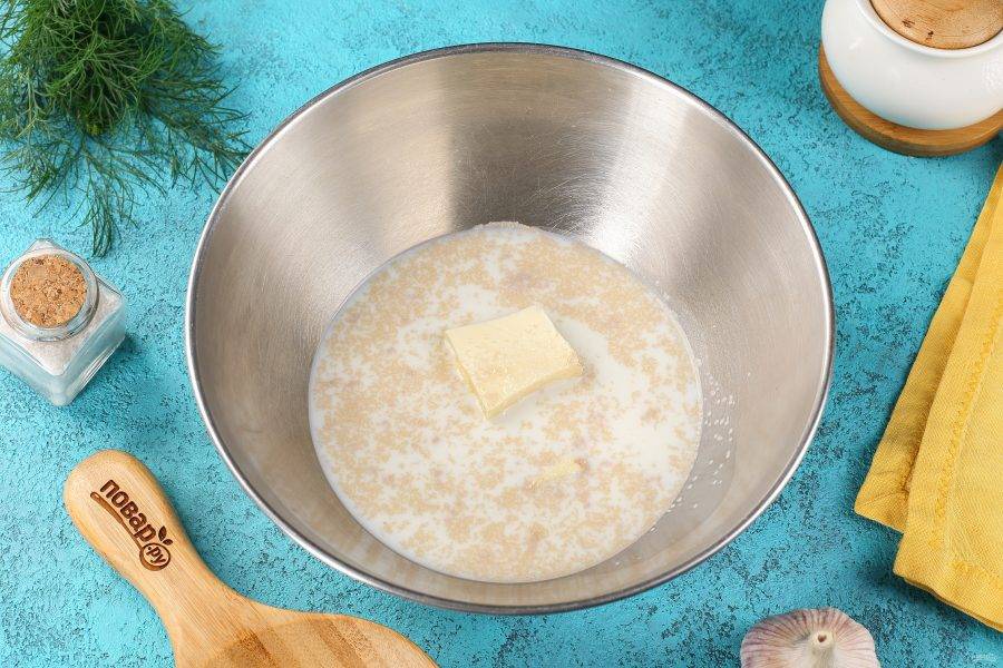 Соедините тёплое молоко, сливочное масло, дрожжи и сахар.