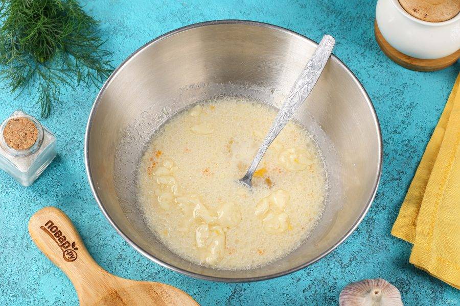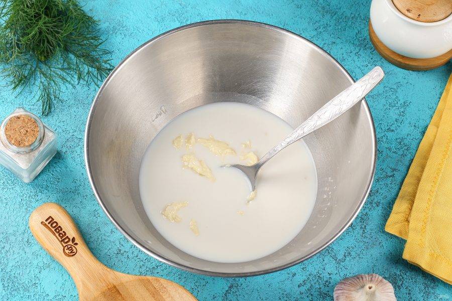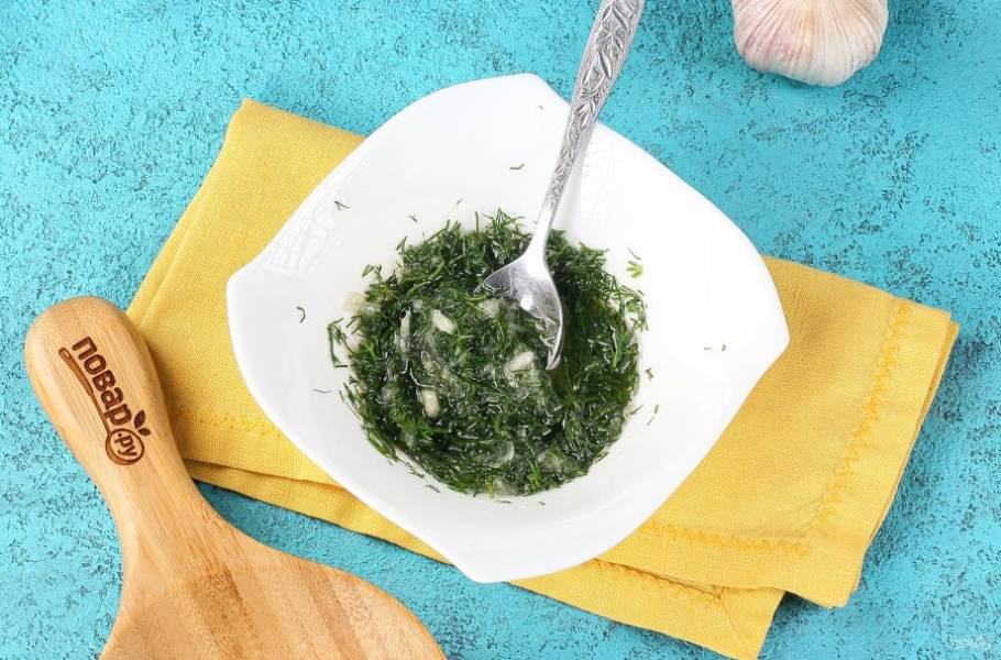 В мисочке соедините 2 ст.л. масла, 2 ст.л. воды, давленый чеснок, 1-2 щепотки соли и измельчённый укроп.