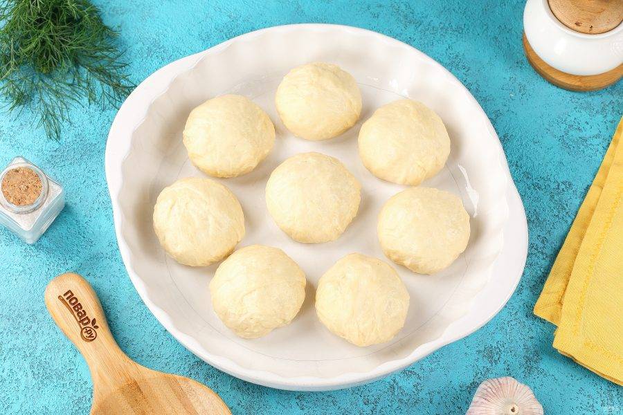 Сформируйте из теста одинакового размера шарики, у меня получилось 8 штук по 100 грамм. Выложите их в смазанную маслом форму на некотором расстоянии друг от друга.