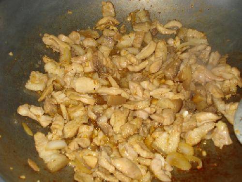 Отдельно жарим немного чеснока и лука. Добавляем мясо и готовим в течении нескольких минут. Затем нужно приправить солью, перцем и налить немного соевого соуса. Оставляем в сторонке.