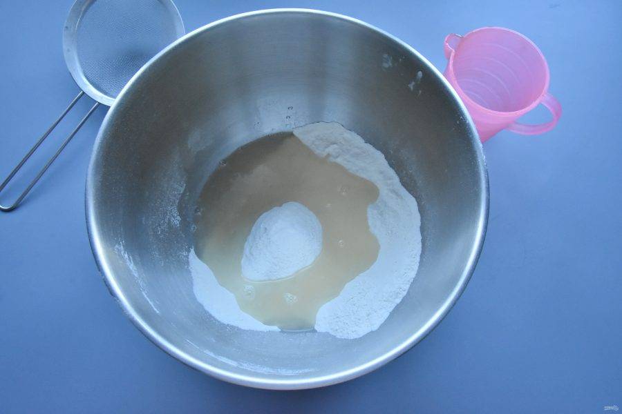 В муку влейте подготовленный сахарный сироп.