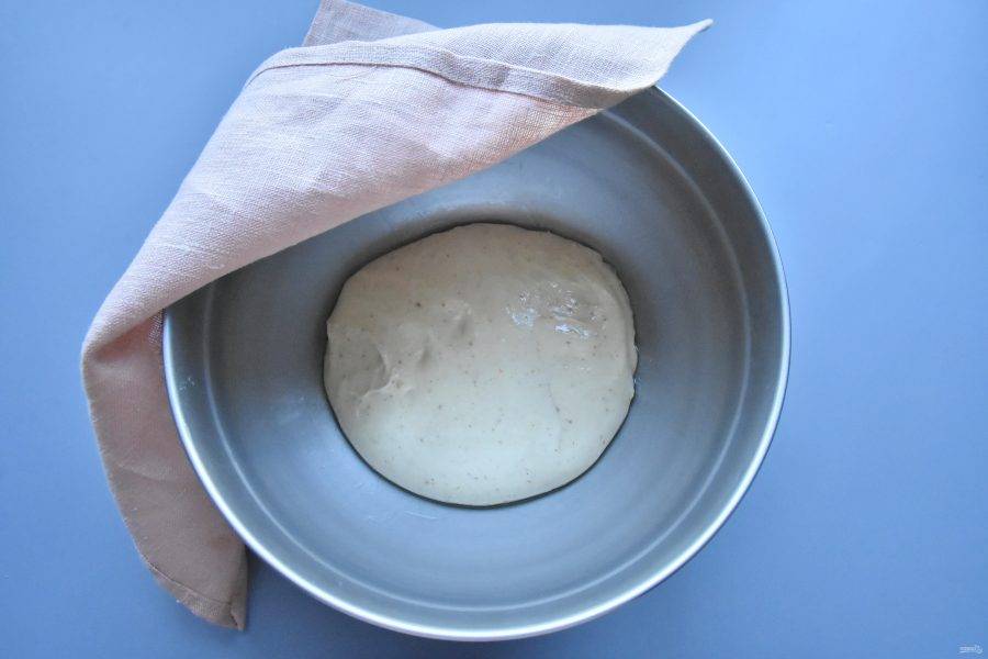 Емкость с тестом накройте пищевой пленкой или кухонным полотенцем и оставьте в теплом месте для подъема. Тесто на закваске поднимается не так быстро как на дрожжах (3-6 часов).