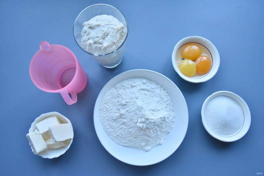 Тесто для итальянского панеттоне замешивается в два этапа. На первом этапе подготовьте: 80 мл. воды, 3 яичных желтка, 60 граммов закваски, 80 граммов мягкого сливочного масла, 225 граммов муки и 70 граммов сахара.
