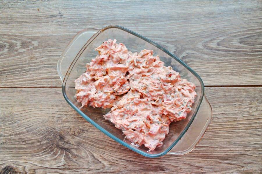 Запекайте рыбу под шубой в горячей духовке при температуре 180 градусов в течение 35 минут.