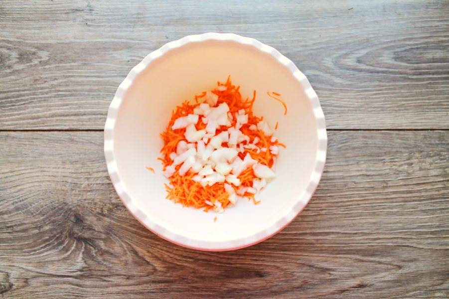 Репчатый лук мелко порежьте и добавьте к моркови.