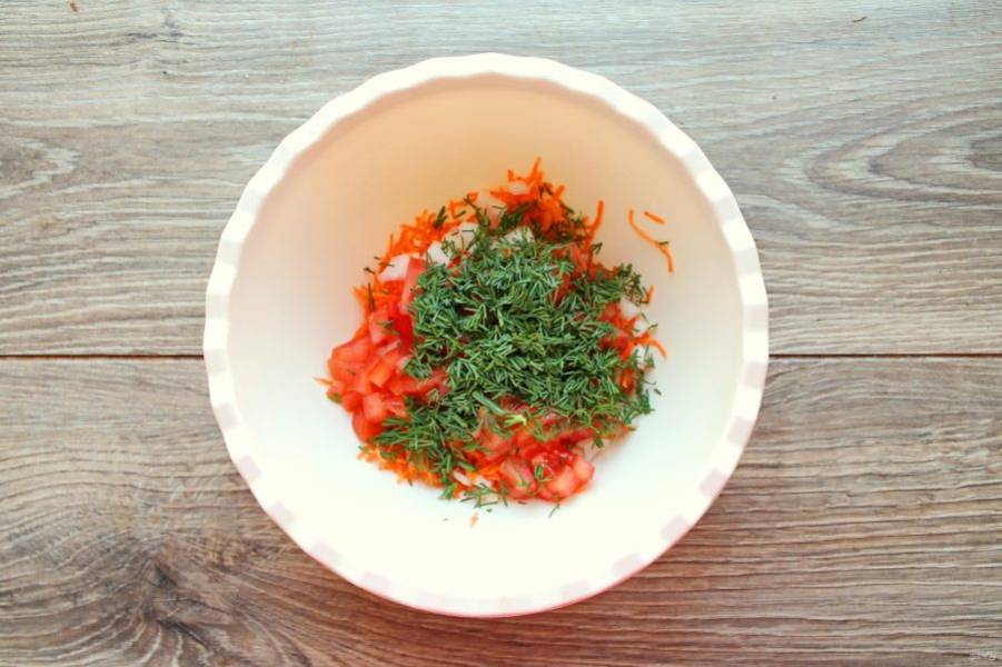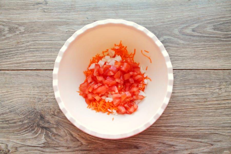 Помидор порежьте мелким кубиком и добавьте к овощам.