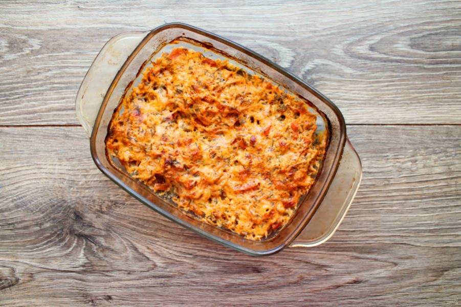 Филе пангасиуса порежьте на порционные куски и выложите в форму для запекания, смазанную растительным маслом. Сверху выложите овощную массу.