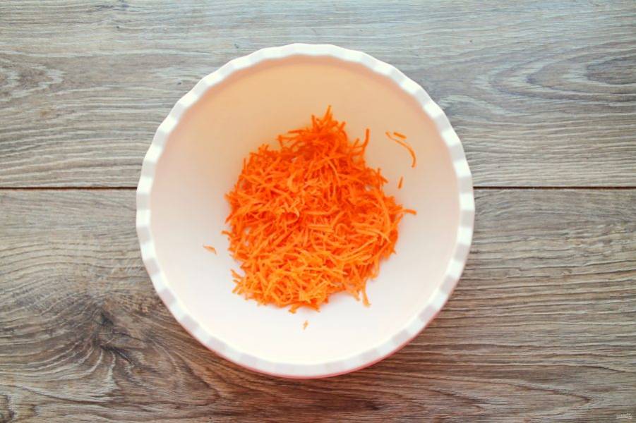 Морковь очистите и натрите на средней терке, выложите в миску.