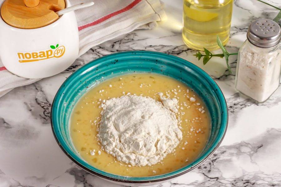 Затем вмешайте в массу пшеничную муку, всыпьте разрыхлитель. Влейте растительное масло и еще раз перемешайте.