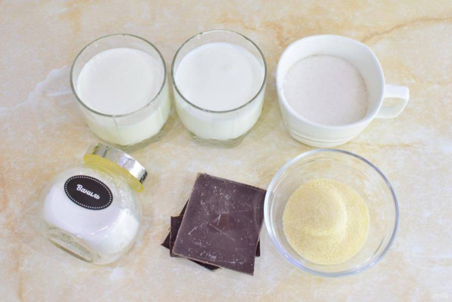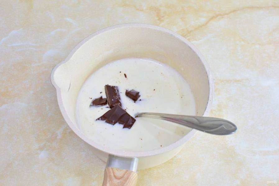 Для шоколадного слоя соедините оставшееся молоко, сливки и сахар. Доведите до кипения и добавьте шоколад. Дайте ему растаять. Затем в горячую массу введите желатин. Смешайте. Для однородности можно пробить погружным блендером.