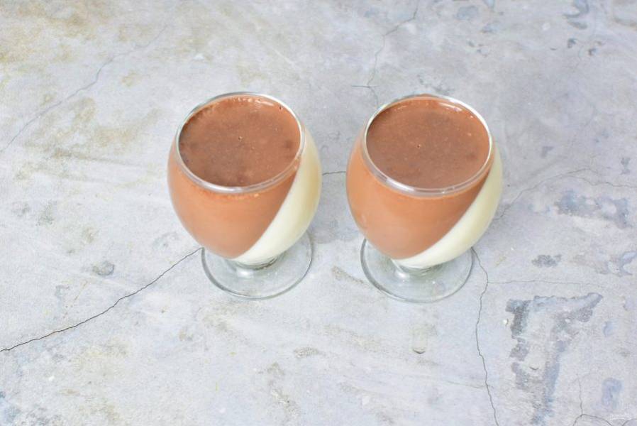 В стаканчики разлейте ванильный слой. Сами стаканчики расположите под наклоном. Уберите в холодильник на 2-4 часа, до полного застывания.