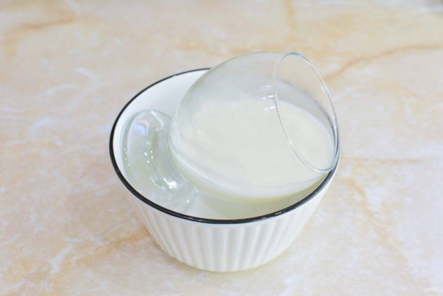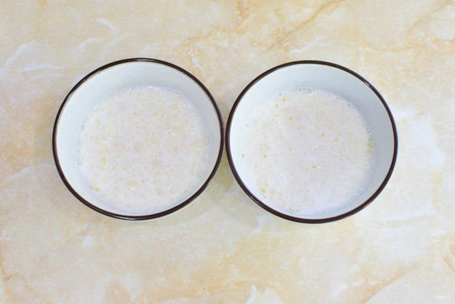 В двух мисках замочите желатин в молоке. В каждую миску выложите 10 грамм желатина и влейте 60 мл. холодного молока. Оставьте постоять на 20-25 минут для набухания.