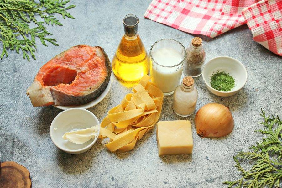 Подготовьте все необходимые ингредиенты для приготовления папарделле с лососем. У лосося удалите кости и кожу.