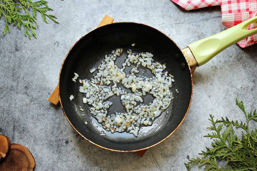 Пока варится паста, подготовим рыбу. Репчатый лук почистите и мелко порежьте. В сковороду налейте растительное масло, добавьте репчатый лук и обжаривайте в течение 5-7 минут.
