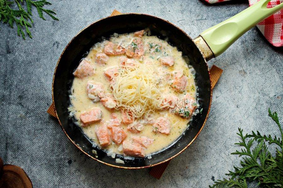 Сыр натрите на средней терке, добавьте в сковороду с рыбой и сливками, перемешайте.