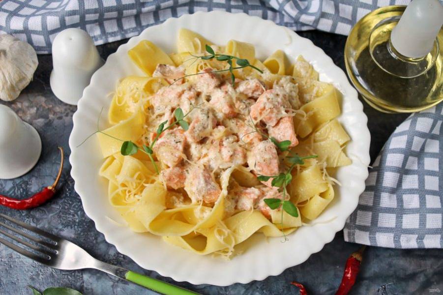 Готовьте все в течение трех минут на медленном огне, аккуратно перемешивая. Теплую пасту разложите по тарелкам, добавьте соус с лососем. Посыпьте зеленью и подавайте.
