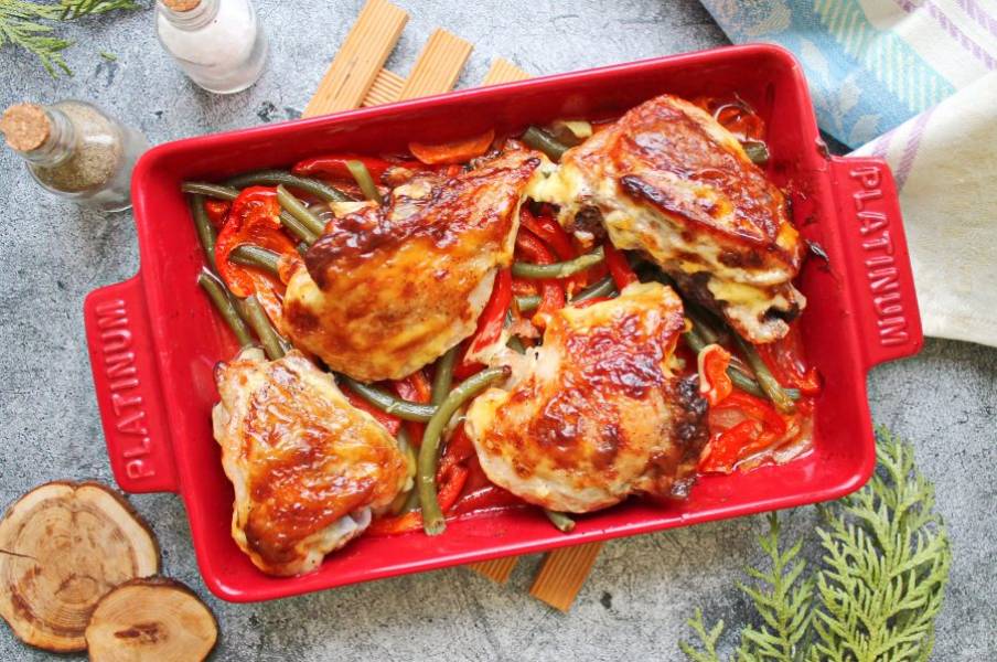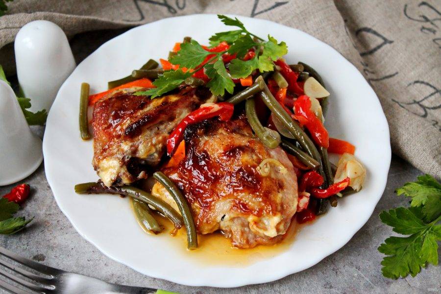 На овощи с папоротником выложите обжаренные части курицы. Форму закройте фольгой для запекания и поставьте в горячую духовку на 30 минут при температуре 180 градусов.