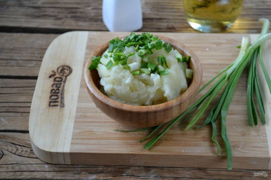 Зеленый лук мелко порубите и добавьте к картофельному пюре, хорошенько перемешайте.