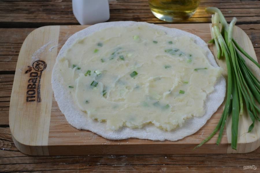 Тесто разделите на 4 части. 1 часть тонко раскатайте, выложите на нее половину картофельной начинки ровным слоем.