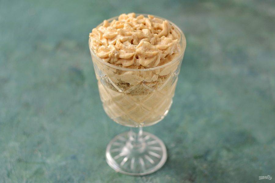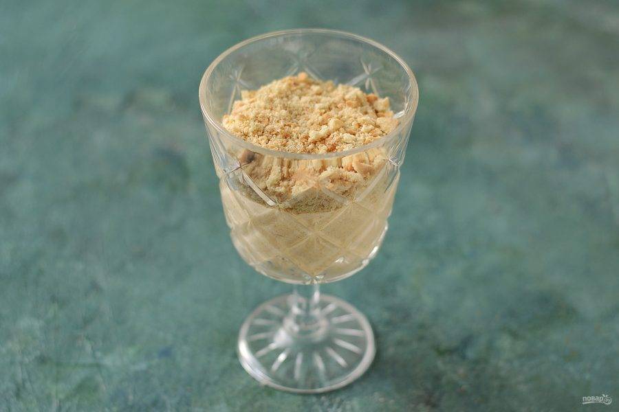 Заполните получившимся кремом половину бокала. Проложите слой измельченным в крупную крошку печеньем.
