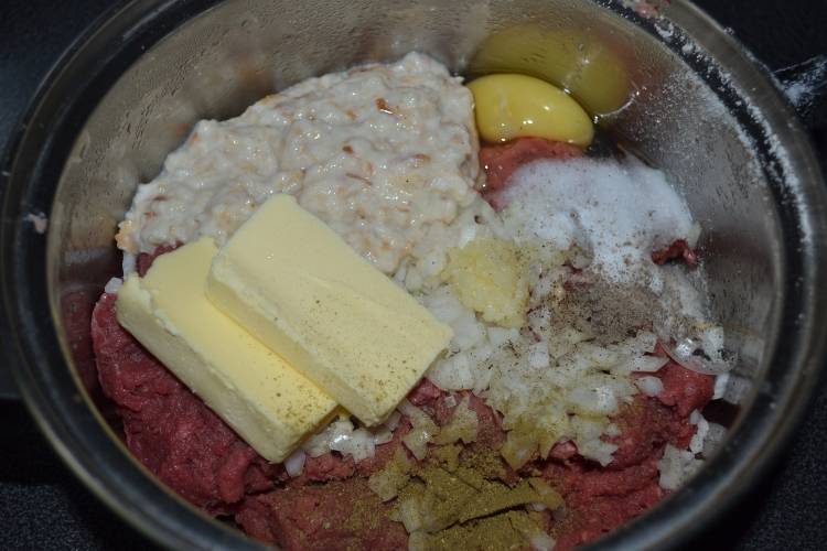 Затем выкладываем в миску с фаршем предварительно размоченный в молоке хлеб, сливочное масло, яйцо, солим и приправляем специями.