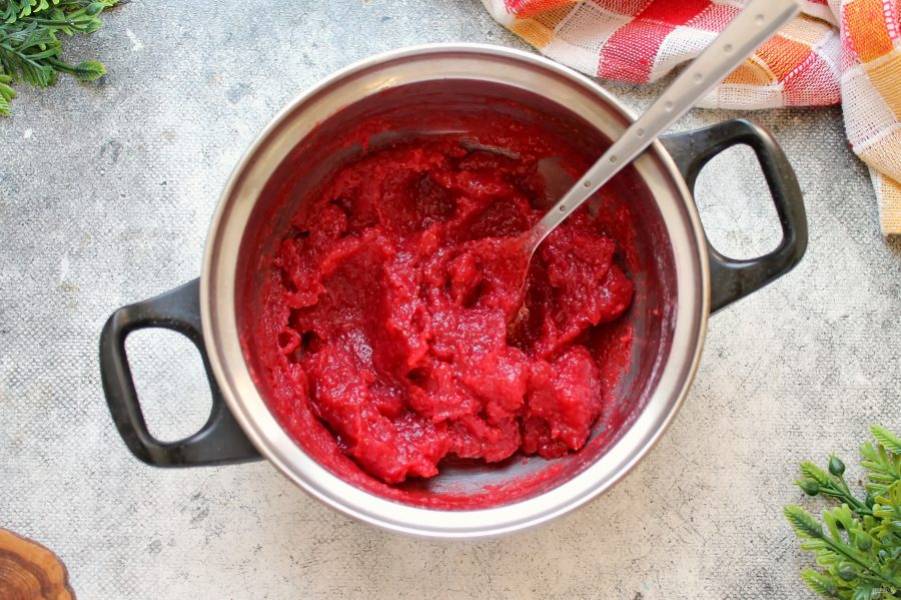 Кастрюлю с пюре поставьте на средний огонь и нагрейте до горячего состояния. Сахар смешайте с пектином и введите в пюре дождиком, интенсивно перемешивая. Доведите до кипения и варите, мешая 2-3 минуты. Снимите кастрюлю с огня и полностью остудите начинку. Не пугайтесь, что она кажется вам жидкой, после остывания она станет густой.