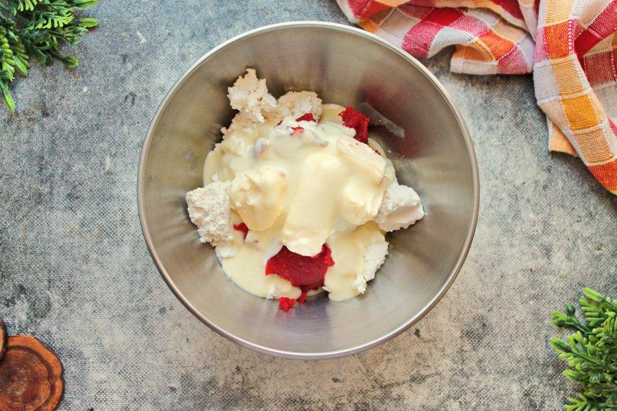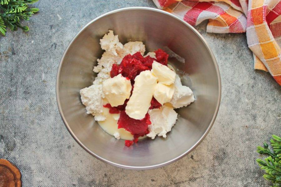 Мягкое сливочное масло порежьте на части и добавьте к творогу, сгущенке и начинке.