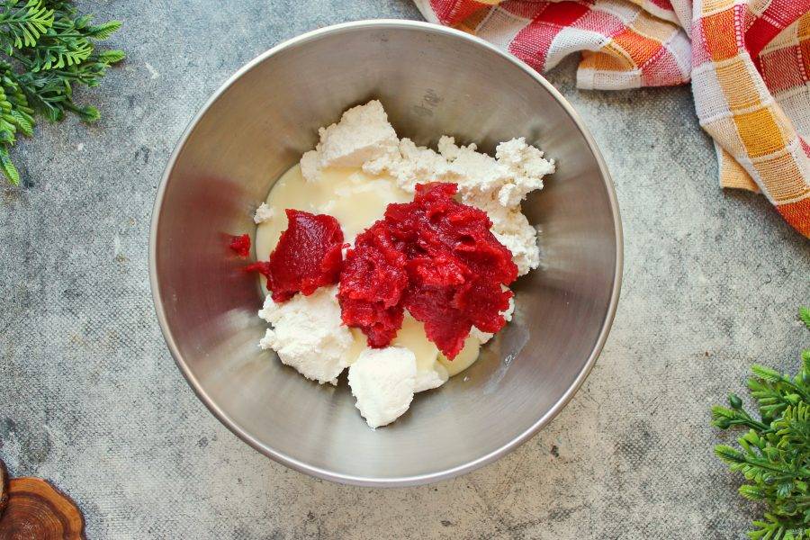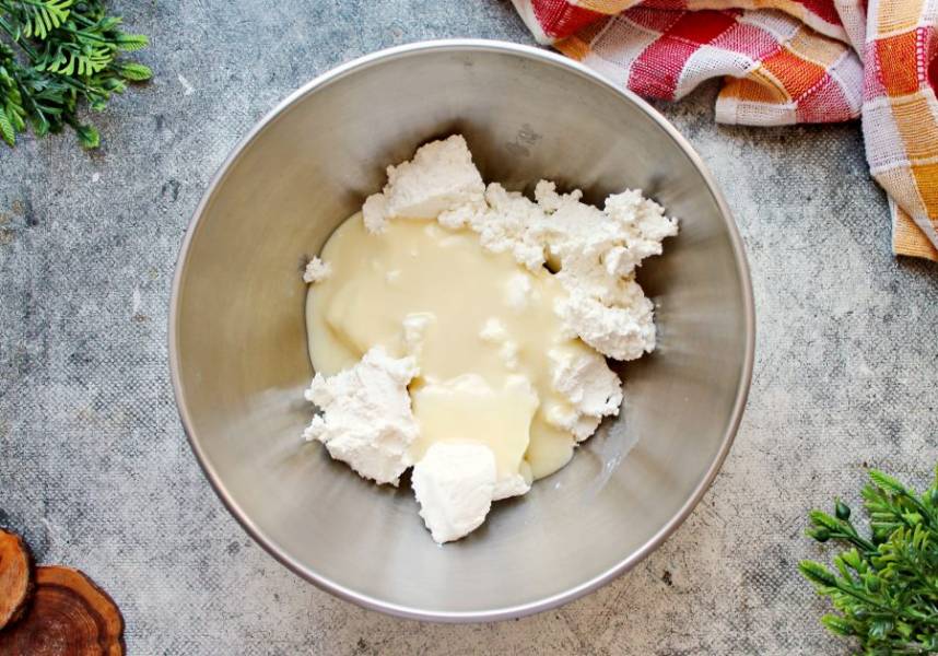 Творог выложите в миску и добавьте сгущенное молоко. Молоко берите только натуральное и густое иначе качество, и вкус может быть подпорчен.