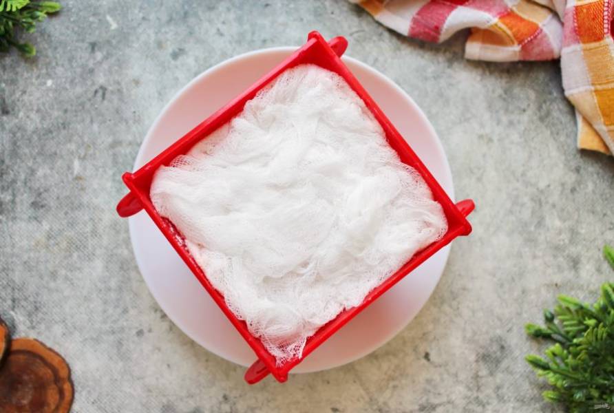 После приготовления уберите сверху марлю и переверните пасху на тарелку. Аккуратно удалите форму и снимите марлю. Украсьте пасху и подавайте на стол.