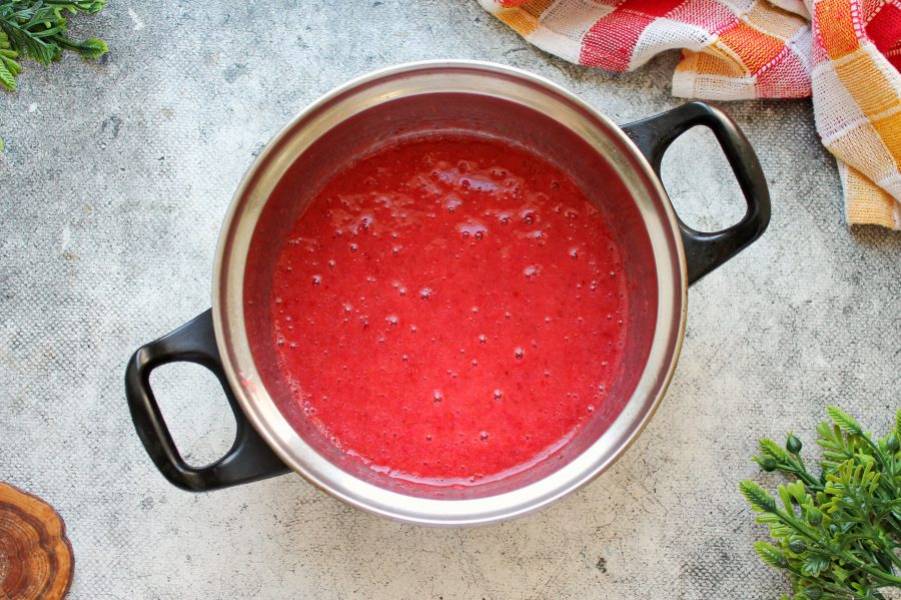 Клубнику переберите, удаляя мятые и порченые, вымойте и откиньте ее на сито. Дайте воде стечь, обсушите на бумажном полотенце и удалите хвостики. Разрежьте ягоды на части, сложите в кастрюлю с толстым дном и пробейте погружным блендером до состояния пюре. Если нет блендера, измельчите ягоды любым удобным способом.