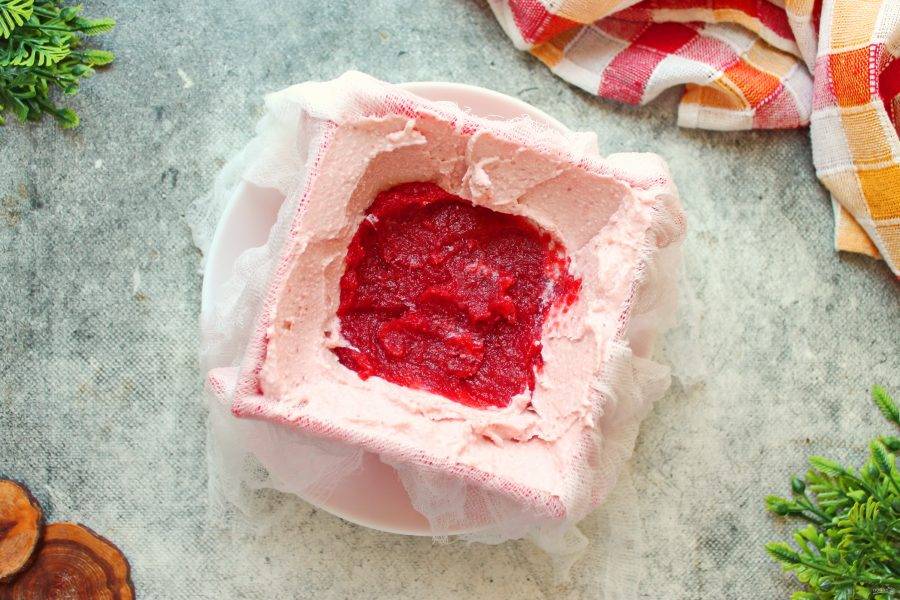 Соберите форму для формирования пасхи и застелите ее внутри влажной марлей, сложенную в 2-3 слоя, чтобы края свисали. Положите внутрь 2/3 творожной массы, плотно прижимая ко дну и нанеся на стенки формы. Уложите оставшуюся клубничную начинку и прижмите к творогу.