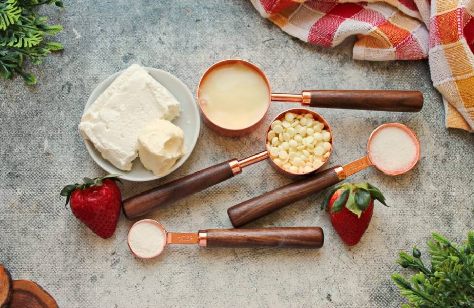 Подготовьте все необходимые ингредиенты для приготовления пасхи клубничной. Клубнику берите яркую и ароматную.