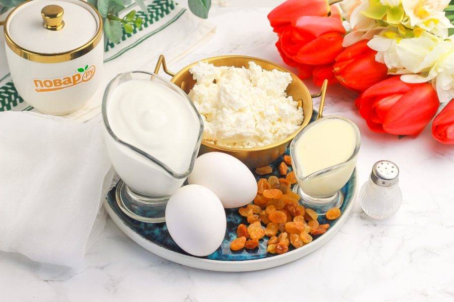 Подготовьте указанные продукты, извлеките их из холодильника за полчаса перед началом приготовления. Если творог и сметана не достаточно жирные, то используйте и сливочное масло — 50 грамм.