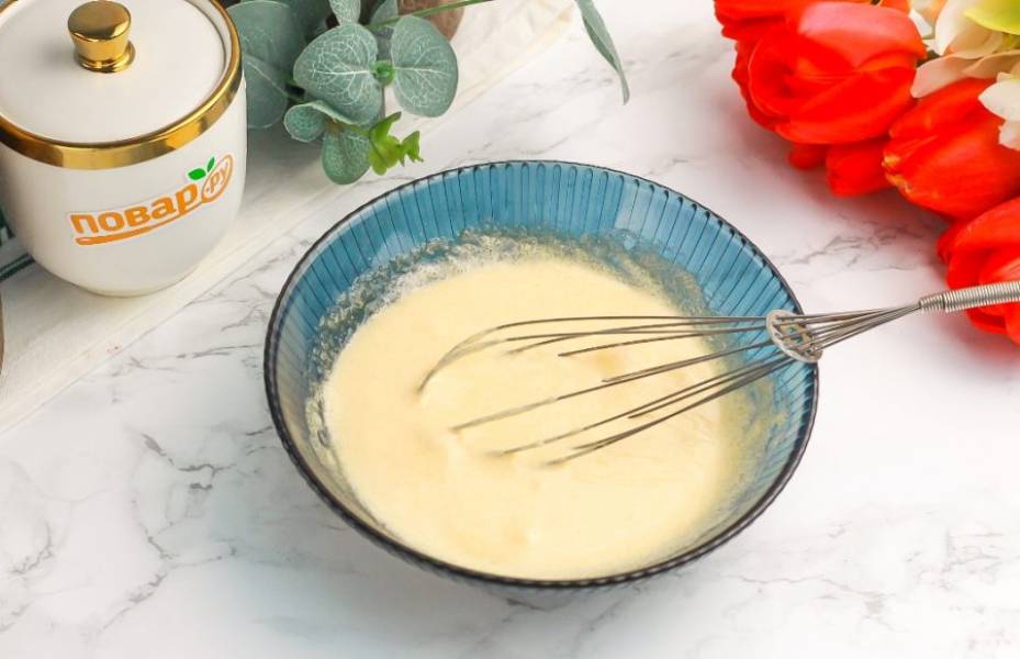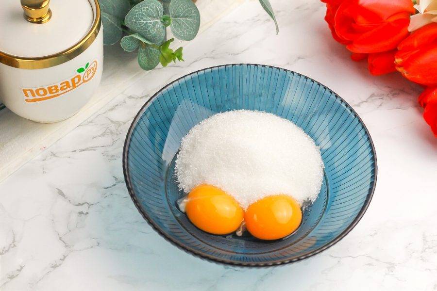 Взбейте желтки с сахаром в пышную пену до побеления, быстро орудуя венчиком, чтобы желтки не заварились. Сахар должен раствориться.