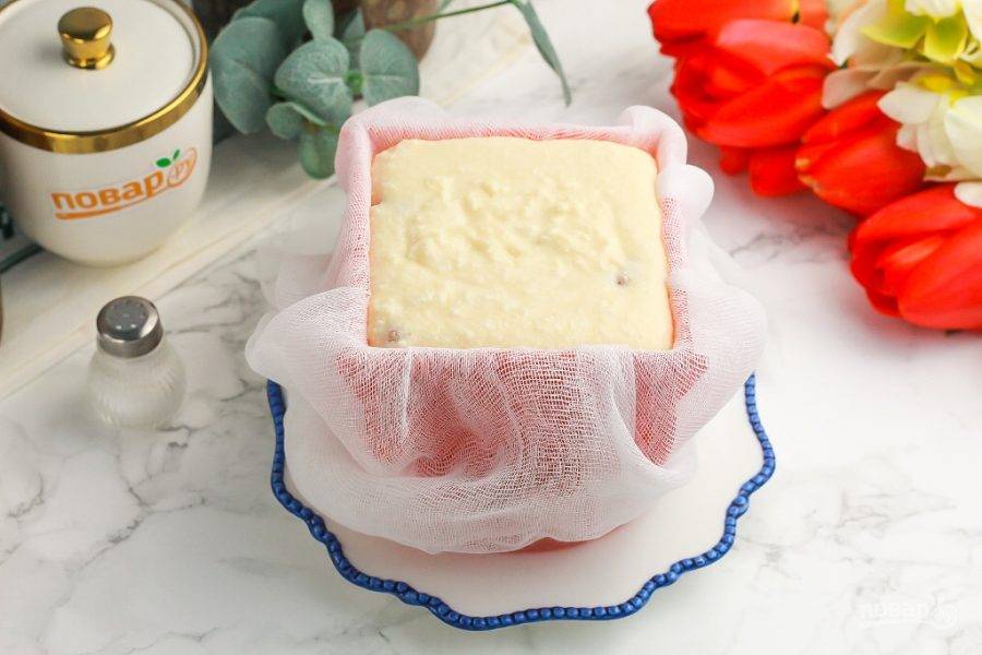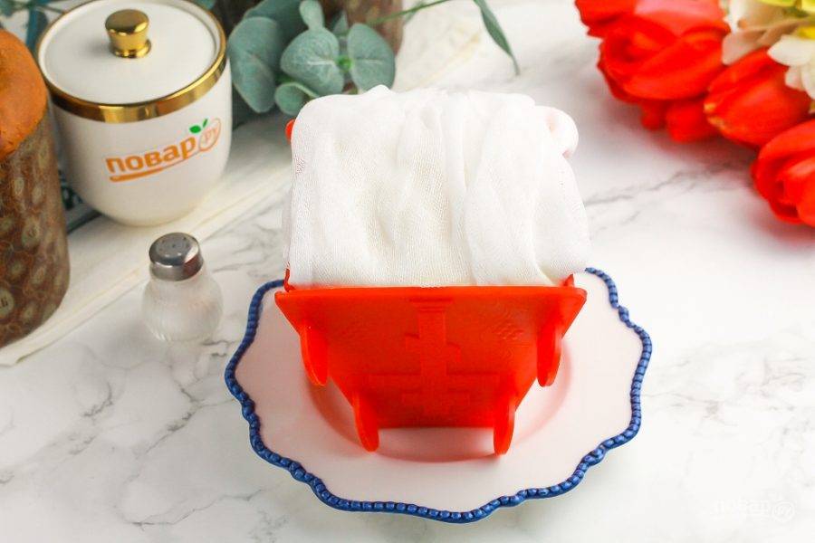 Заверните концы марли наверх и поместите пасху в холодильник минимум на 1 час, а лучше — до утра. По желанию — можно сверху разместить гнет.