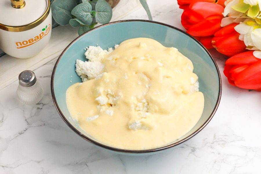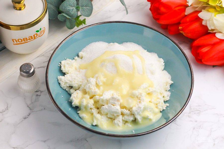 Творог выложите в глубокую емкость и добавьте туда же сгущенное молоко, остаток сахарного песка. По желанию можно всыпать немного ванильного сахара и влить лимонный сок.