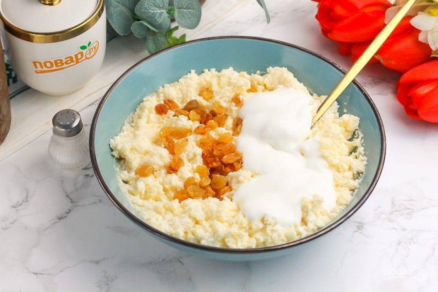 Последними добавьте изюм (его можно заранее пропарить в кипятке, если любите мягкие сухофрукты) и сметану любой жирности. Еще раз хорошенько перемешайте всю массу.
