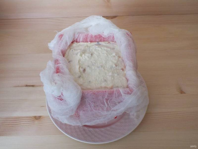 Наполните форму творожной массой, слегка потряхивая, тем самым утрамбовывая. Накройте остатками марли сверху.