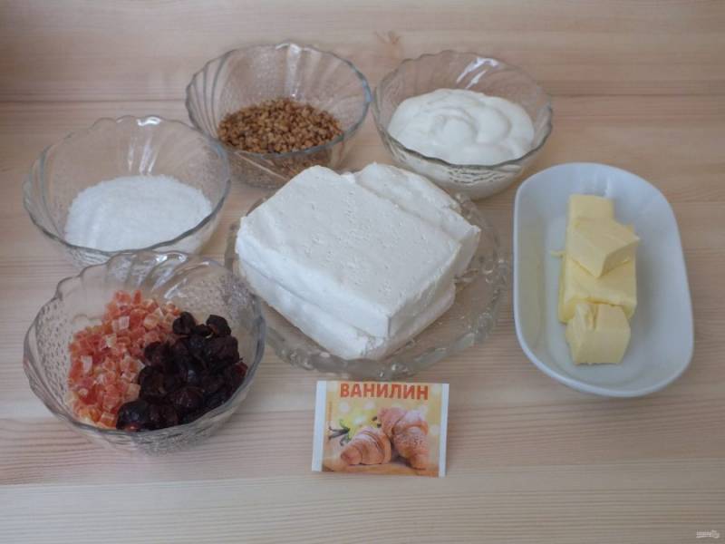 Смешайте творожную массу со сметанной, добавьте мягкое масло, ванилин и еще раз пробейте блендером.