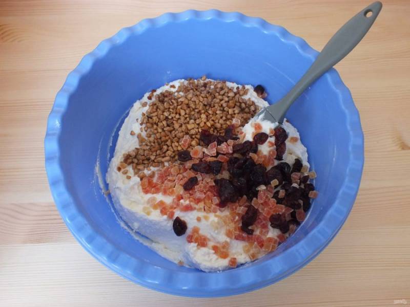 В полученную однородную массу добавьте орехи и цукаты. Перемешайте.