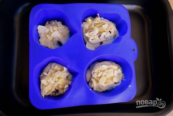 Разложите тесто по силиконовым формам, заполняя их на 2/3 от всего объема. Сверху посыпьте миндальными лепестками.