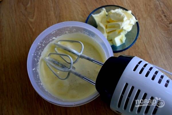 Духовку разогрейте до 180 °C. Яйца взбейте с сахаром, ванилином и солью в пышную белую пену. Добавьте постепенно, по 1 ст. л., размягченное масло, каждый раз перемешивая до однородности.