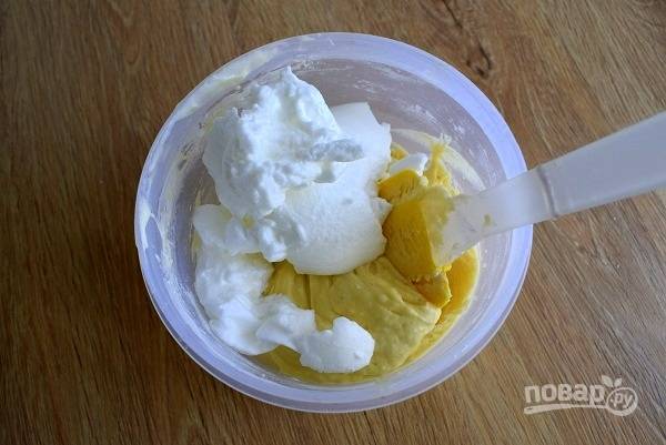 Введите постепенно муку, перемешивая лопаткой снизу вверх. Белок взбейте до крепких пиков, Добавьте в тесто, перемешайте аккуратно с помощью спатулы.