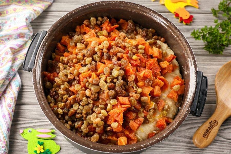 Сухофрукты добавьте в тесто, курагу разрежьте на части.
