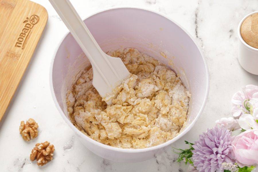 Сначала перемешайте всё ложкой, затем продолжите замес руками.
