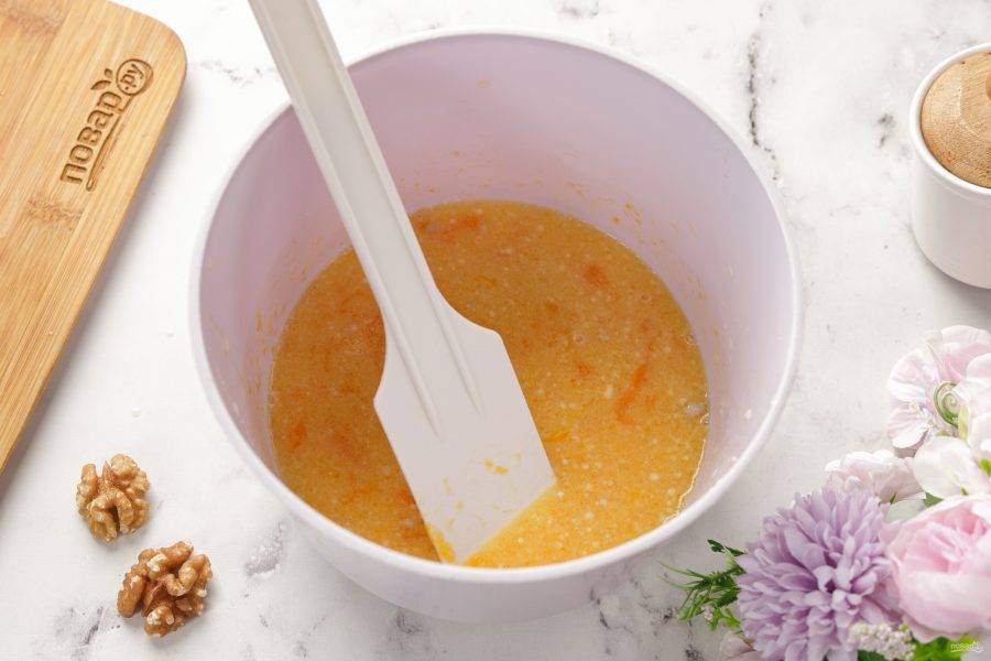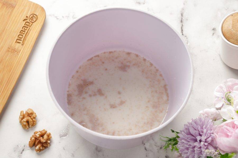 Добавьте тёплое молоко и перемешайте.