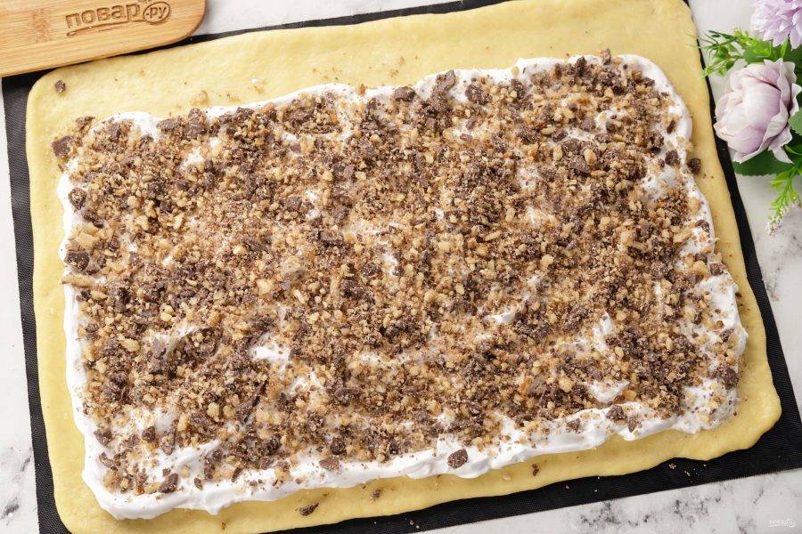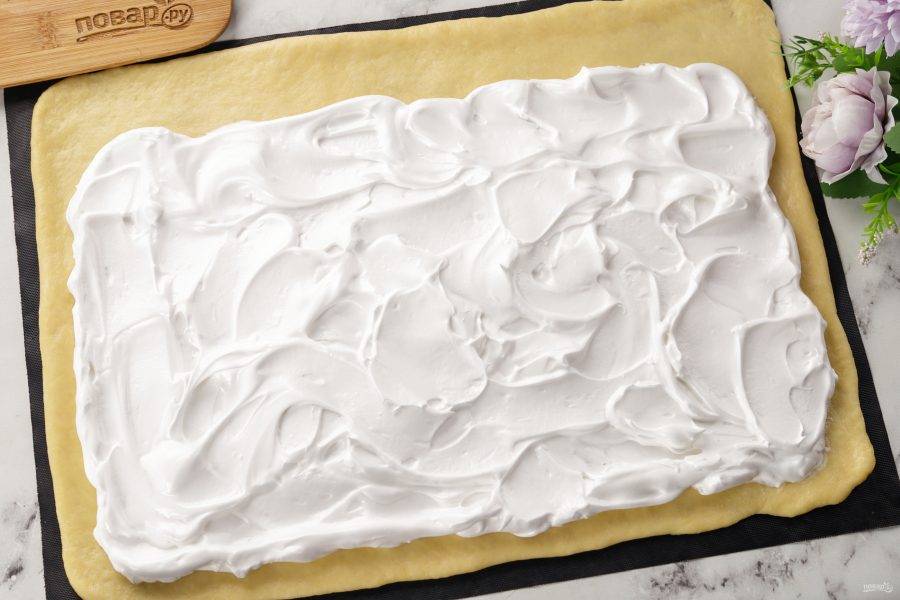 Тесто поднялось. Достаньте его, разомните ещё раз, после чего раскатайте в пласт — прямоугольник. Сначала намажьте меренгу, отступив от одного края 4-5 см.