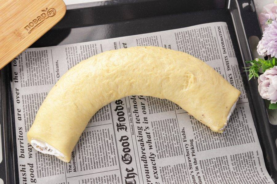 Сверните в рулет. Края можно не защипывать, так как начинка не "убежит". Перенесите на противень, застеленный пергаментом. Если планируете подать рулет на стол целиком, то можно соединит края, чтобы получилось кольцо, а затем при помощи ножа сделать по кругу надрезы — получится пасхальный цветок. Оставьте на 20 минут, накрыв полотенцем.