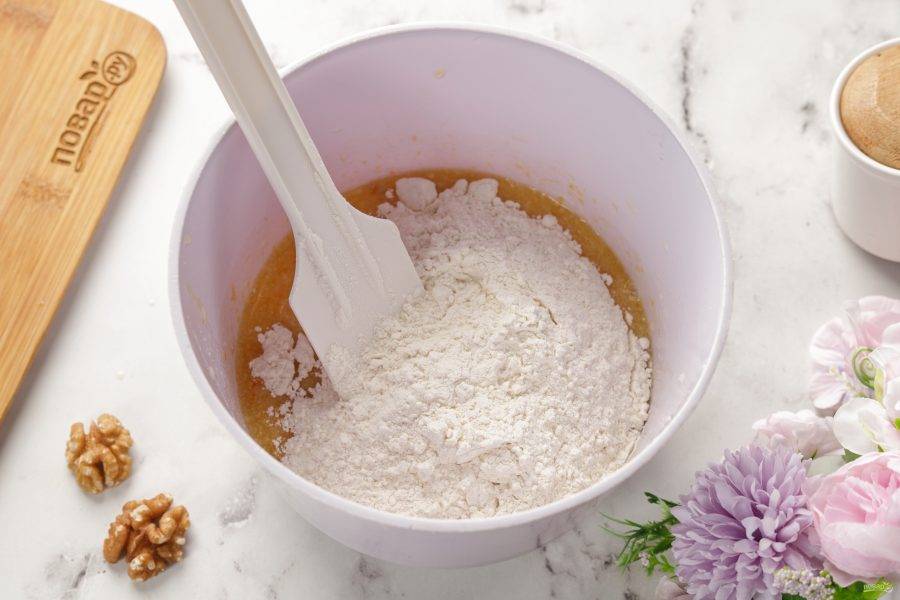 Далее добавьте просеянную муку и начните замешивать тесто.