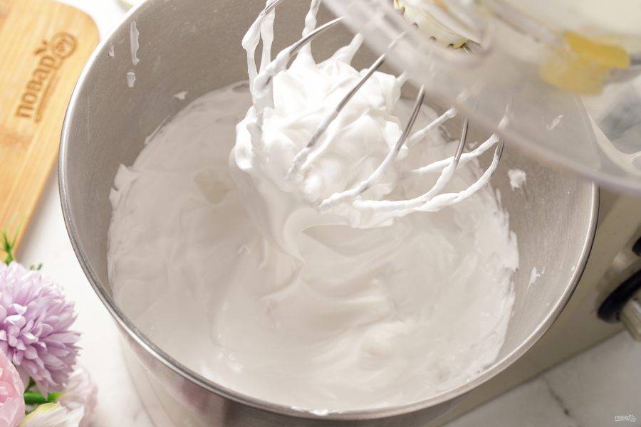 Сделайте меренгу. Взбейте охлаждённые белки до пышной пены на маленькой скорости. Затем скорость увеличьте и постепенно добавьте сахар. Продолжайте взбивать до устойчивых пиков. Это значит, что если вы вытаскиваете венчик, то должен быть вот такой клюв.